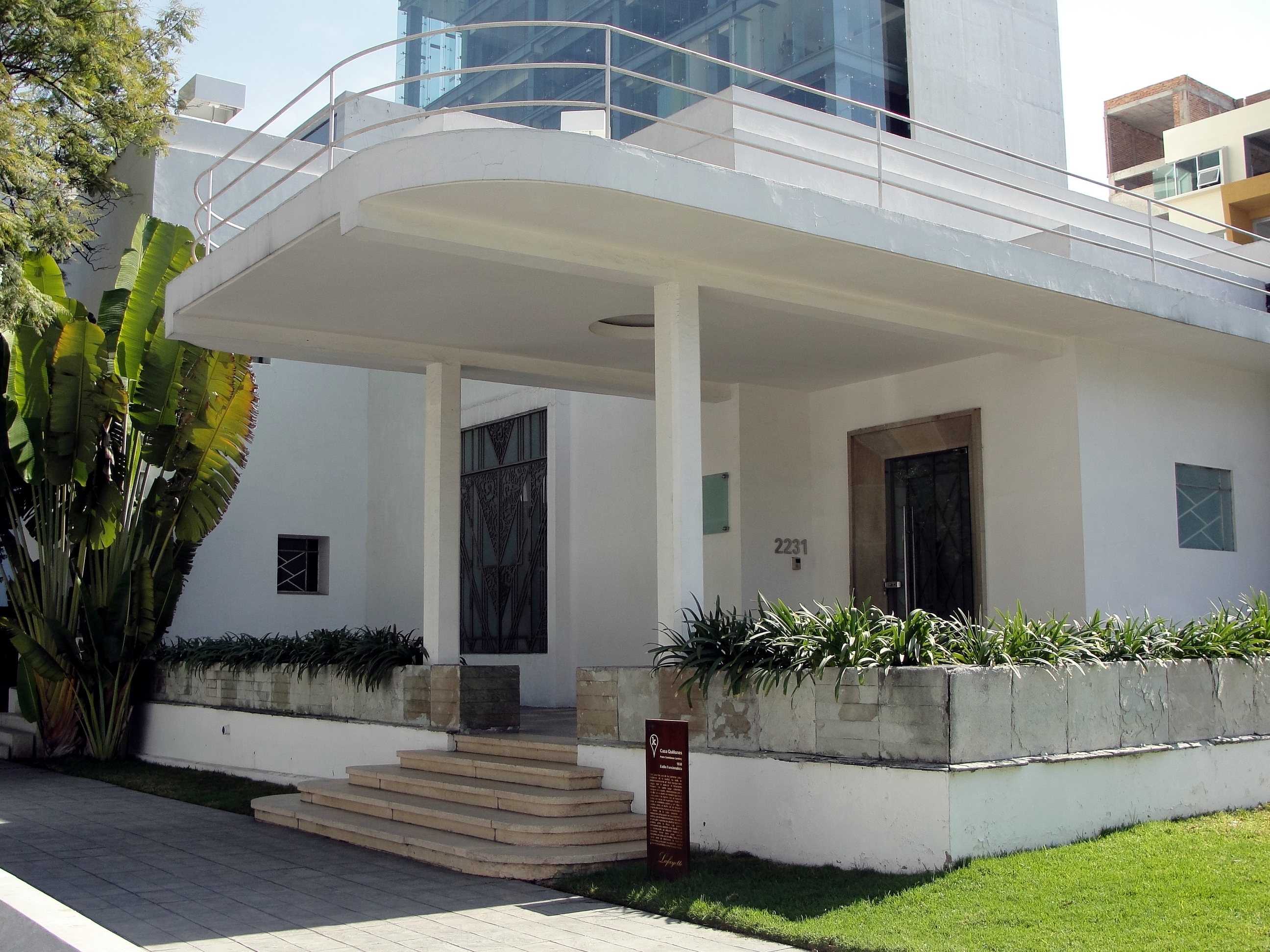 La Casa Quiñones, concluida en 1930, es quizá su obra más lograda y uno de los primeros ejemplos de arquitectura moderna en Guadalajara. Frente a un contexto dominado por la casa tapatía tradicional, Castellanos proyectó aquí una residencia de líneas depuradas y volúmenes geométricos, que incorporaba el lenguaje funcionalista sin renunciar a detalles de refinado Art Déco. El acceso principal se enfatiza con un pórtico volado sostenido por columnas esbeltas, mientras que la gran ventana enmarcada hacia avenida La Paz exhibe una extraordinaria herrería de diseño geométrico y floral, uno de los elementos más distintivos de la finca. Los barandales metálicos de la azotea y los ventanales de ritmo vertical refuerzan la sensación de modernidad y ligereza.