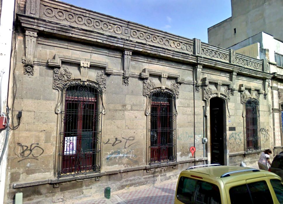 This interesting stone house is located on Pavo St., just half a block from López Cotilla on the western side of the block. The house dates from around 1920-1930. We can calculate the age by looking at the profusely made Art Nouveau carvings, featuring floral styling of good proportions, especially on the pediments of doors and windows. The parapet design is geometric, unusual for Art Nouveau but seen frequently on eclectic houses in the city. These combine elements from different styles, forming a unique architectural current, mostly designed according to the taste of the architect or owner. Today, the building serves as the local office of the Combonian Missionaires, a catholic order.