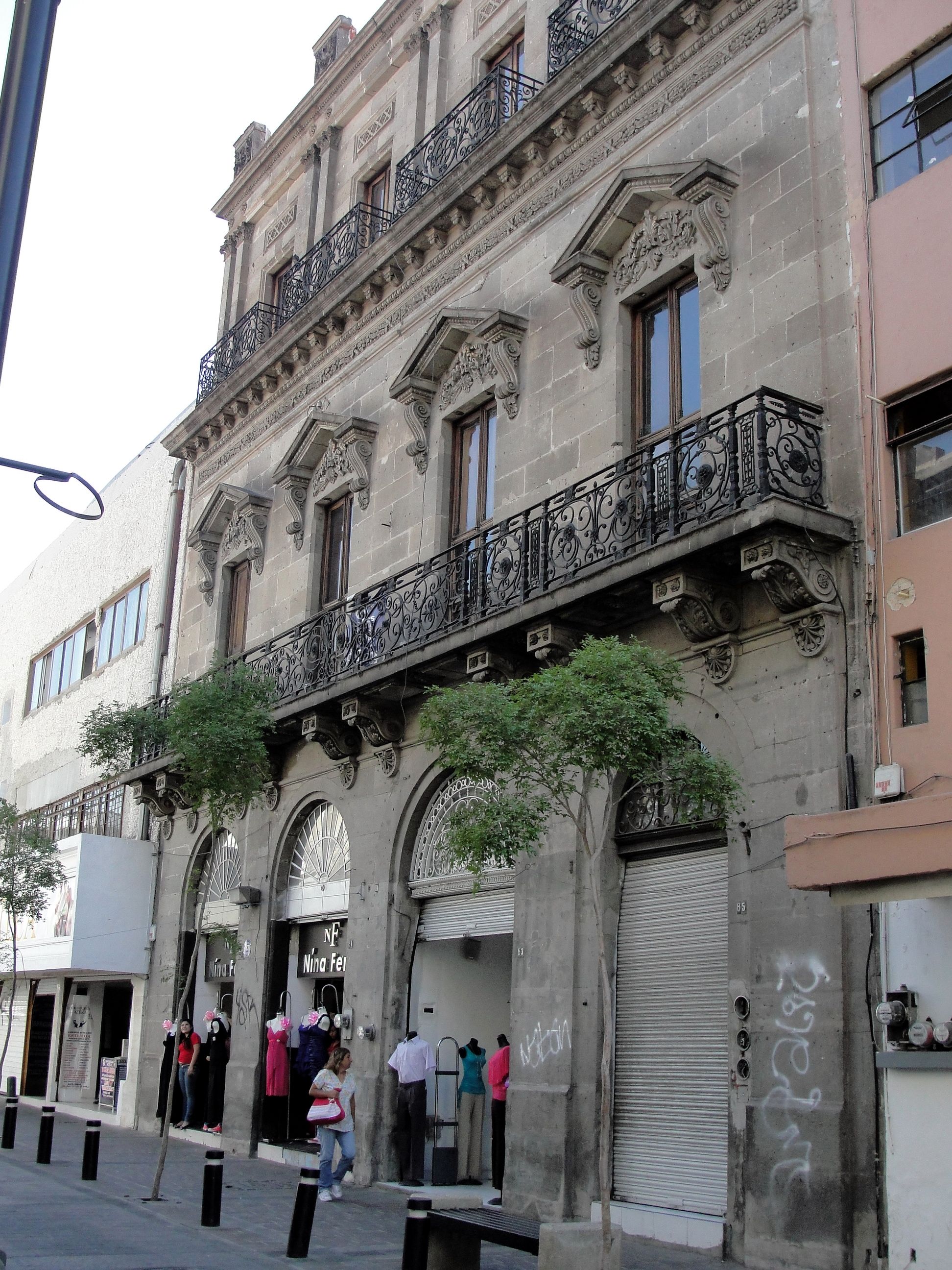 Ubicado frente al edificio de Ocampo 80 que revisamos esta misma semana, se encuentra éste, marcado con los números 79-81. De tres niveles y fachada de cantera gris en excelente estado de conservación, hoy en día funciona como hostal en sus plantas superiores, y comercio en su planta baja. Su estilo es neoclásico afrancesado, típico de las construcciones haussmanianas de París de 1870-1890 y modelo aspiracional para las clases altas tapatías de la época que mandaban construír estos verdaderos palacetes.