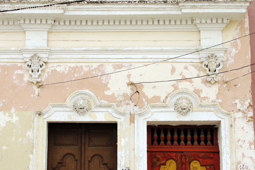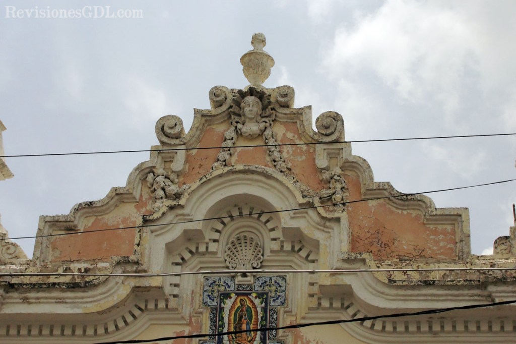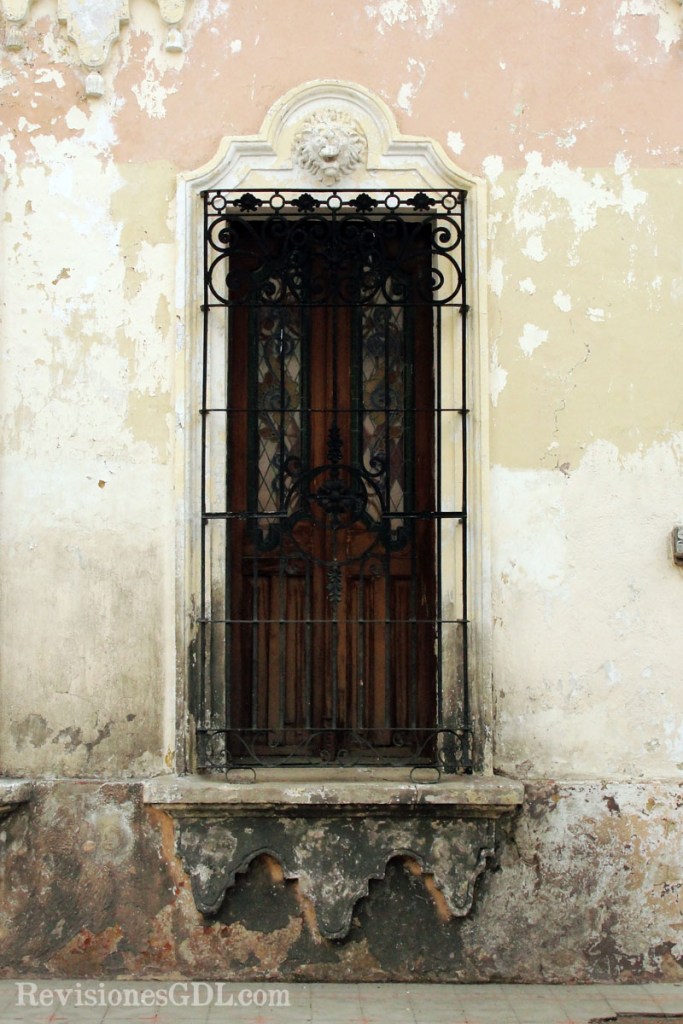 Another typical work of mason Villalpando is this house, located just half a block south of the Botanical Garden. It presents the usual characteristics of Villalpando’s work: elaborate pediment designs in doors and windows, in this case with lion mascarons; cherubs in the architrabe; elaborate parapet featuring a centerpiece, containing mascarons, garlands and throphies. This design was tacky even for its time, but typical of Villalpando. It’s interesting that the original lead-lined windows are in fairly good condition after almost 100 years. Exterior paint must be redone, but the overall detailing of the house is decent.