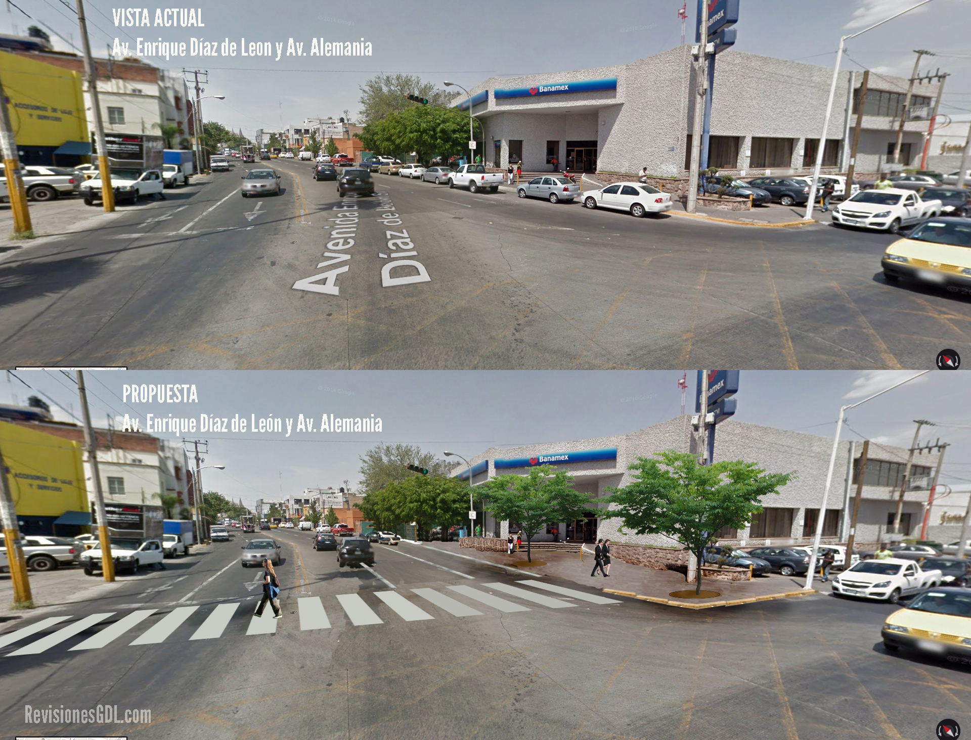La propuesta consiste en aprovechar el espacio formado por una vuelta muy ancha, formada por el ángulo en que la Av. Alemania se incorpora al norte hacia la Av. Enrique Díaz de León, con un radio de giro muy abierto. Esto provoca que los autos den vuelta continua a la derecha muy rápido, provocando peligro para los peatones que cruzan E. Díaz de León, que ademas es muy ancha.