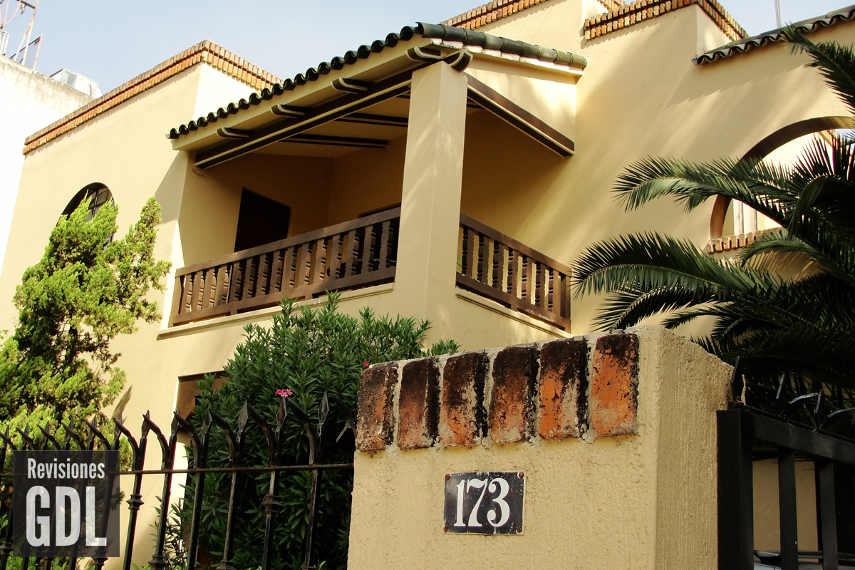 Uno de los clásicos ejemplos de arquitectura residencial de estilo regionalista, típicos del arquitecto Pedro Castellanos, esta casa se encuentra en excelente estado de conservación. La casa está ubicada en un tramo de la calle General San Martín, entre López Cotilla y Avenida La Paz, que incluye varias viviendas interesantes, muchas de ellas discutidas en este espacio (General San Martín 172 y 186).