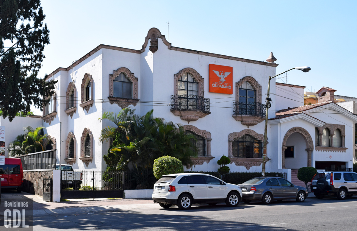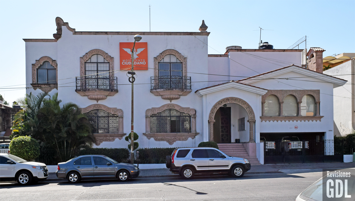 Un ejemplo de la arquitectura «Colonial Californiano» o «Estilo Polanco» en la ciudad, es esta finca ubicada en Av. La Paz, entre dos casas que ya revisamos aquí (La Paz 1925 al poniente, La Paz 1877 al oriente). A diferencia de ejemplos más sencillos, pero mejor ejecutados del estilo (Av. Chapultepec 451), esta casa presenta un mayor trabajo de labrado de cantera, comúnmente señal de mayor presupuesto de parte del propietario. Sin embargo esta finca es en realidad es un híbrido entre un proyecto con planta moderna, y uno del estilo californiano en fachada, que no carece de arcos, balcones, frontones elaborados, tejas de barro y hasta el obligado nicho con figura religiosa. Hoy la casa es sede de Movimiento Ciudadano, un partido político.