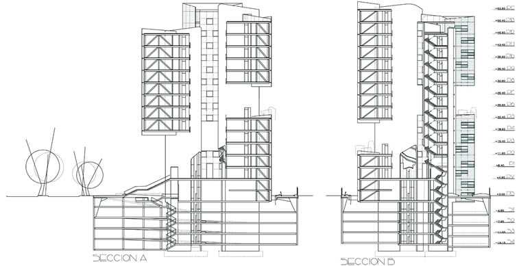 El proyecto consta de tres módulos de oficinas libres de columnas, de entre 100 y 150 metros cuadrados, divididos por pasillos y sostenidos por un núcleo de concreto que alberga tres elevadores -uno por sección- baños comunes y las escaleras de emergencia. La estructura de losas pos-tensadas, diseñadas por el despacho de Luis Bozzo (que trabaja comúnmente en mancuerna con Pinós) hacen que los módulos rentables del edificio floten varios niveles por encima de la calle. Esto, junto con los muros de concreto curvos en los núcleos y escaleras, le dan movimiento a la estructura que parece más ligera y compacta de lo que en realidad es.