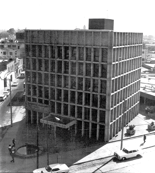 El edificio es un cubo casi perfecto de unos 20 x 20 x 20 metros, y 6 niveles de oficinas. El único elemento que rompe el cubo es la marquesina en la esquina que indica la entrada al mismo. Su elegante composición es completamente hecha en concreto aparente y vidrio. En el afán del arquitecto por lograr la perfección geométrica, resultan bajos los pisos, sobre todo en planta baja, donde la marquesina provoca un sentimiento de ser aplastado por el peso. El predio donde se desplanta el terreno es una especie de triangulo con al esquina en ángulo agudo donde coinciden las calles Libertad y Corona. El arquitecto decidió desplantar el edificio con orientación NE – SP, dándole el frente a la esquina, creando una plaza triangular en cuyo centro se encuentra una fuente redonda. Fiel a la tradición modernista, el edificio debe ser tan simétrico en planta como en alzado. En la parte posterior del edificio, un edificio de una sola planta en forma de «U» se separa del mismo creando una planta intermedia, envolviendo al mismo.