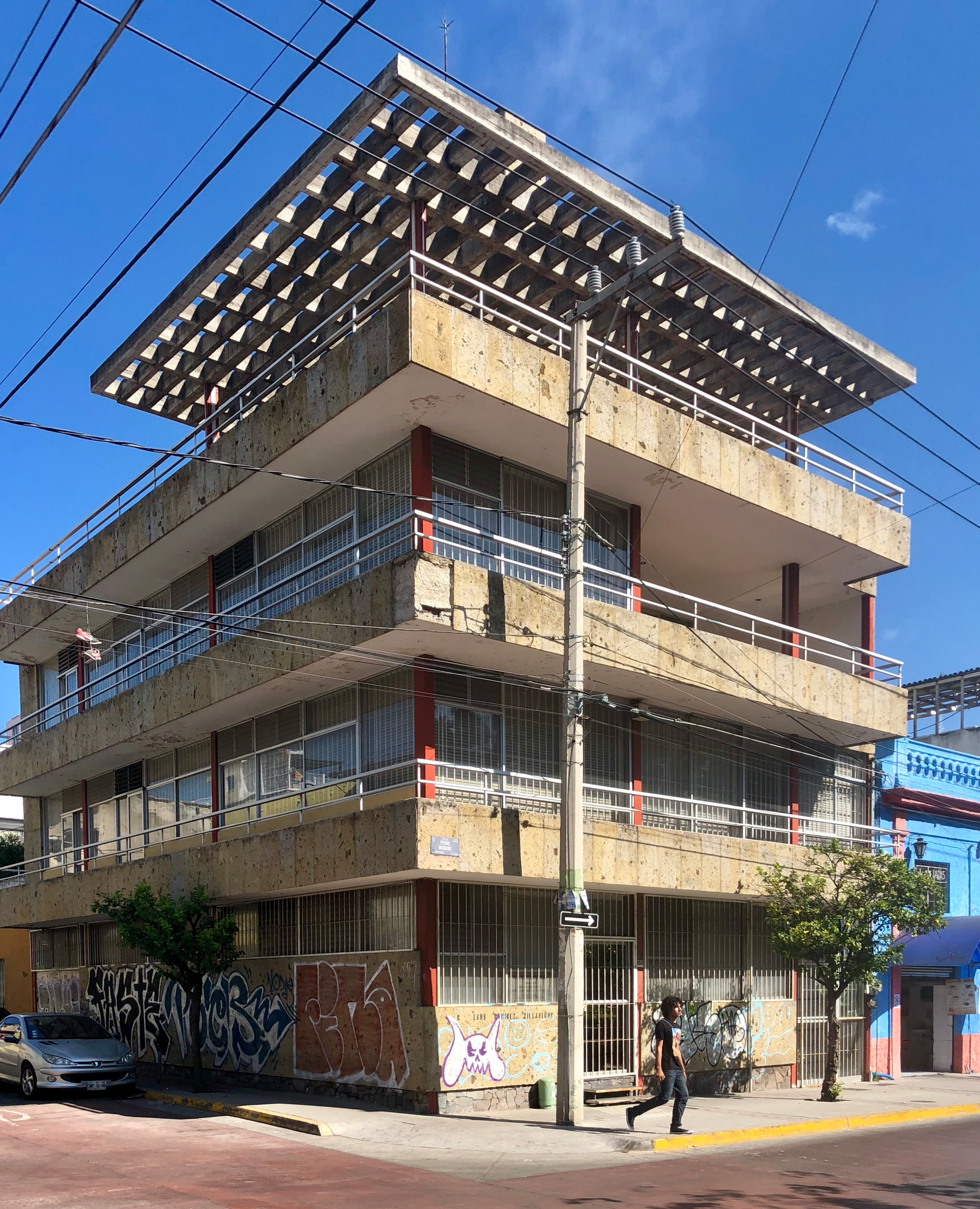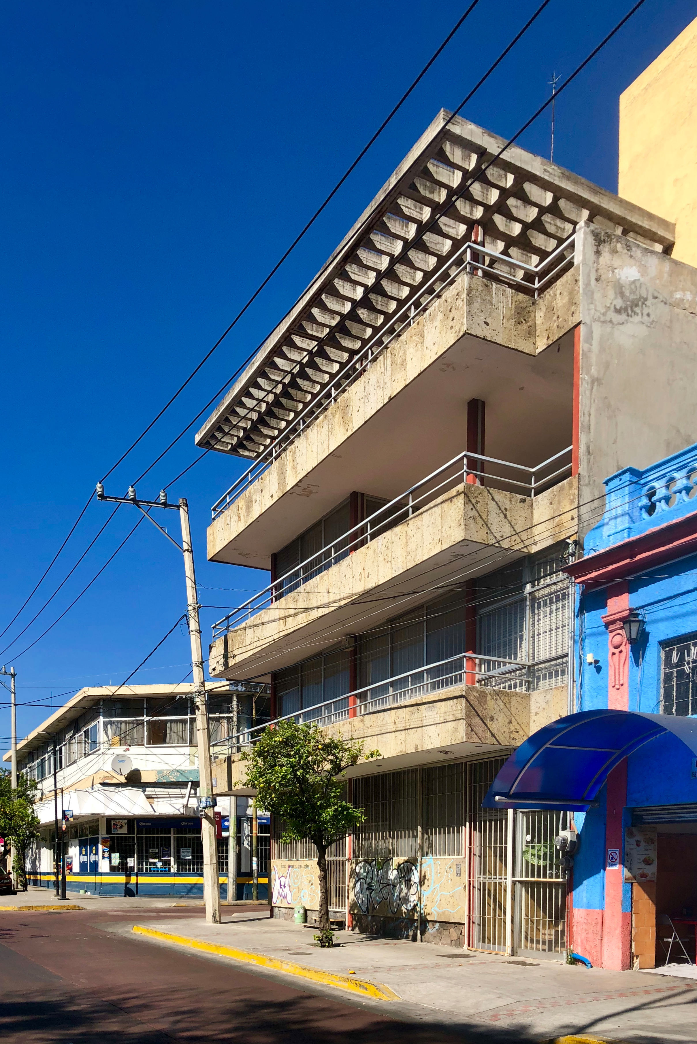 Curioso en cuanto a los ejemplos de arquitectura residencial de uso mixto, este edificio de Alejandro Zohn es una interpretación moderna de las casas clásicas donde se combinaba el uso comercial en planta baja, con el residencial en las plantas superiores. Ubicado directamente frente al Parque Juárez, en un predio de apenas 165 metros cuadrados, su tipología hace que parezca un edificio de departamentos, pero es en realidad una residencia construida para un médico que en planta baja tenía su despacho, y en las altas su casa. Ocupando al totalidad del solar, e incluso poco mas pues los balcones vuelan sobre las banquetas, las dos plantas intermedias albergan las zonas de estar y habitaciones, en un estilo sobrio y minimalista. La característica mas destacada de la construcción es sin duda la pérgola de concreto armado, que forma una cuadrícula y sirve de parasol de media sombra para la terraza, un espacio sin duda interesante y con vista directa al Parque Rojo.