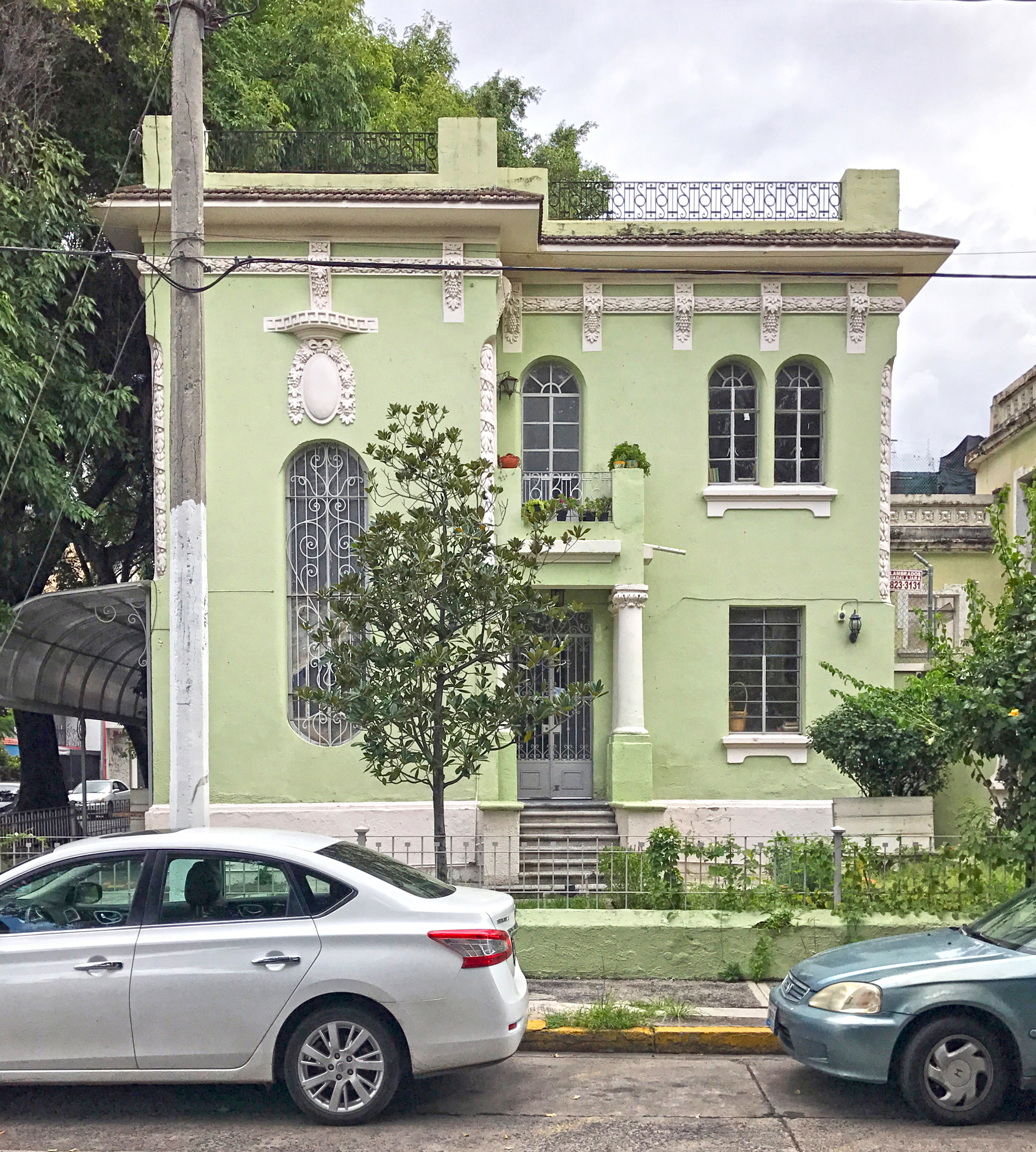 La casa fue probablemente construida entre 1920 y 1930. Sabemos que para 1950 estaba vacía y en renta.* En 1955 se anunciaba la renta de su única cochera (sobre la calle de López Cotilla)**. Hoy es una cafetería. Su vecina al norte, la casa en Argentina 36, fue muy probablemente construida al mismo tiempo por la misma persona, pues comparte tamaño y tipología, aunque su estilo de fachada es diferente. Hoy está siendo remodelada, espero que se respete su originalidad y sea más una restauración.