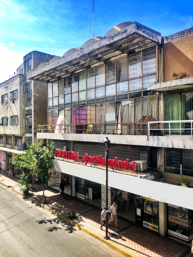 Este edificio moderno, que funciona como papelería en su planta baja y apartamentos en sus altas, es un buen ejemplo de arquitectura moderna en el centro de la ciudad. Conserva una escala y alturas que se mezclan con el entorno histórico, y si bien seguramente hubo demolición de algún edificio regional cuando se construyó, es sin duda un ejemplo cuerdo de las corrientes que en ese momento estaban en boga.