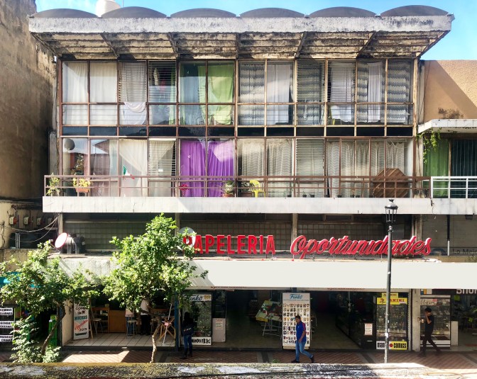 Este edificio moderno, que funciona como papelería en su planta baja y apartamentos en sus altas, es un buen ejemplo de arquitectura moderna en el centro de la ciudad. Conserva una escala y alturas que se mezclan con el entorno histórico, y si bien seguramente hubo demolición de algún edificio regional cuando se construyó, es sin duda un ejemplo cuerdo de las corrientes que en ese momento estaban en boga.