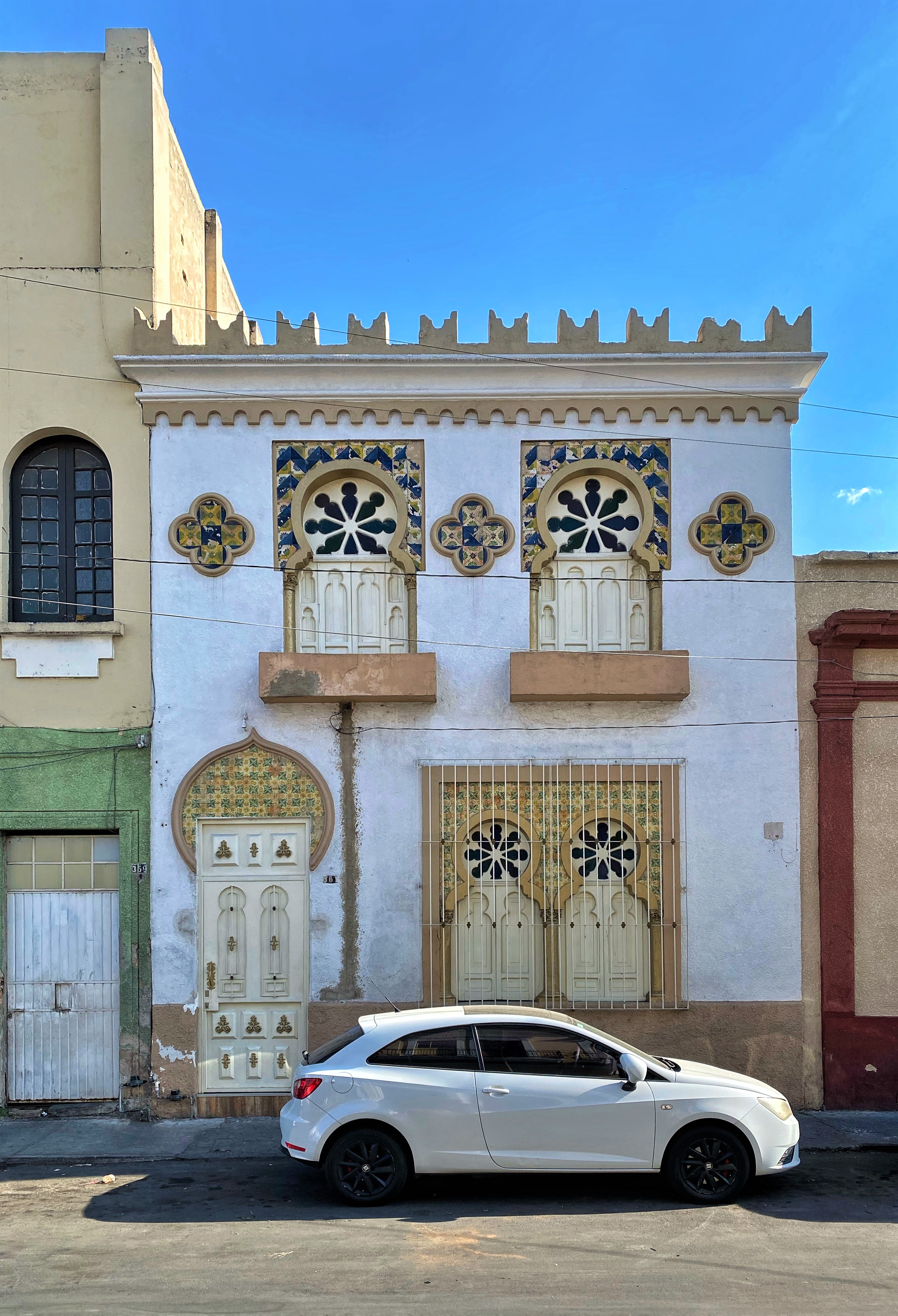 Un ejemplo más de arquitectura ecléctica popular de la década de los 1920’s o 1930’s, (ver: Hospital 757 y González Ortega 277) esta finca con claro estilo morisco se conserva original al 100%. Con la excepción de la herrería añadida a sus ventanas inferiores, los detalles originales de la finca son varios; azulejos de tonos azules y amarillos con diseños florales y geomètricos; las ventanas con arcos lobulados y capiteles corintios; los rosetones de la segunda planta muy al estilo neocolonial mexicano, contrastando con las herrerías con rosetones moriscos y el pretil con el friso y marquesina de proporciones clásicas pero diseño arabesco.