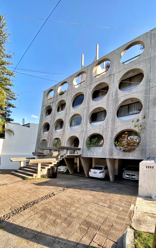 Polémico desde inicio por su estética que rompe con lo tradicional, especialmente en una colonia residencial como Chapalita, el edificio de departamentos para la Familia Verduzco es un ejemplo de la arquitectura funcional pero retadora de Félix Aceves.