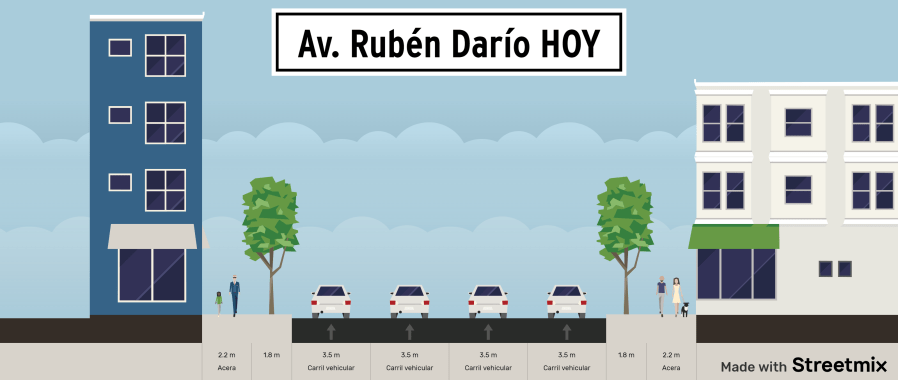 Así es hoy Rubén Darío: 22 metros de ancho, buenas banquetas de 2.2 mts, buenos arriates de 1.8 metros (para grandes árboles) y 4 carriles PARA AUTOS SOLAMENTE en un sólo sentido de 3.5 metros cada uno. Receta para accidentes por la velocidad que pueden alcanzar los coches!
