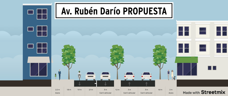 Mi propuesta: Dos carriles de ida en el mismo sentido de hoy, pero de 3m de ancho. Esto no afecta la capacidad de la calle pero modera la velocidad de los vehículos. Camellón arbolado (aminora el ruido, mejora las vistas, provee sombra), un carril de estacionamiento necesario para incentivar el comercio y, más importante, protegiendo una ciclovía.