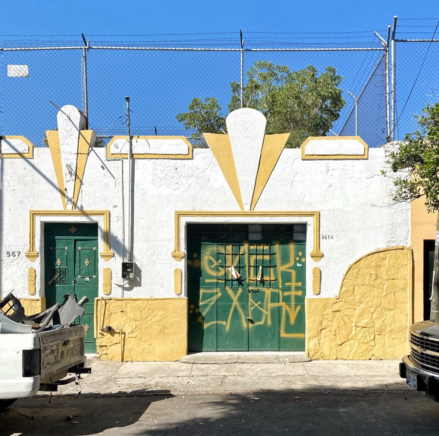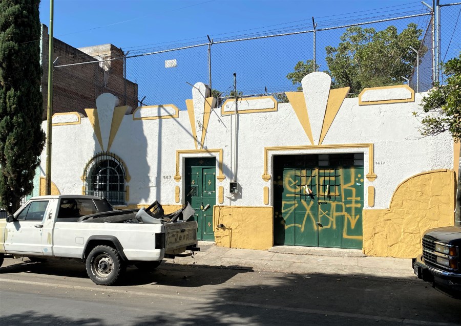 El llamado “Art Déco tapatío” suele manifestarse en casas modestas donde los elementos del estilo se reinterpretan con un eclecticismo cargado de idiosincrasia local. Esta finca en Santa Tere es un ejemplo claro de ello: la sobriedad de su planta tradicional se reviste con recursos plásticos de inspiración déco que buscan modernidad sin romper del todo con el lenguaje regional.