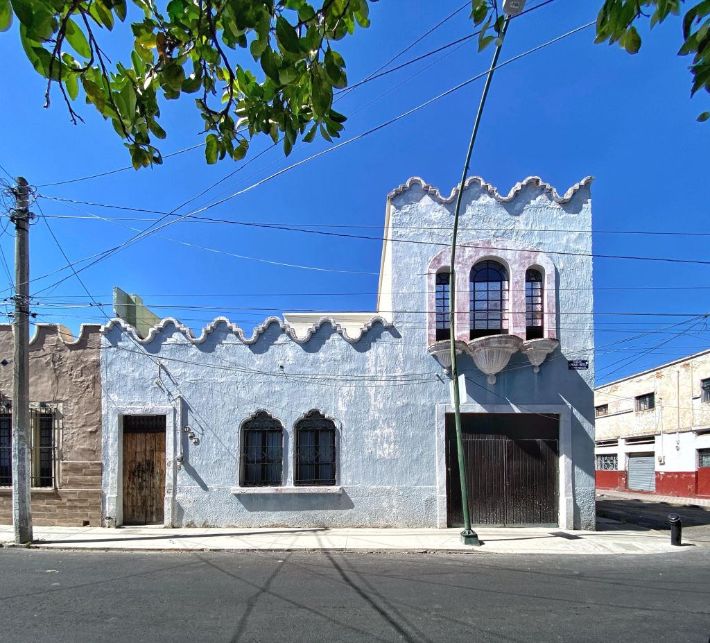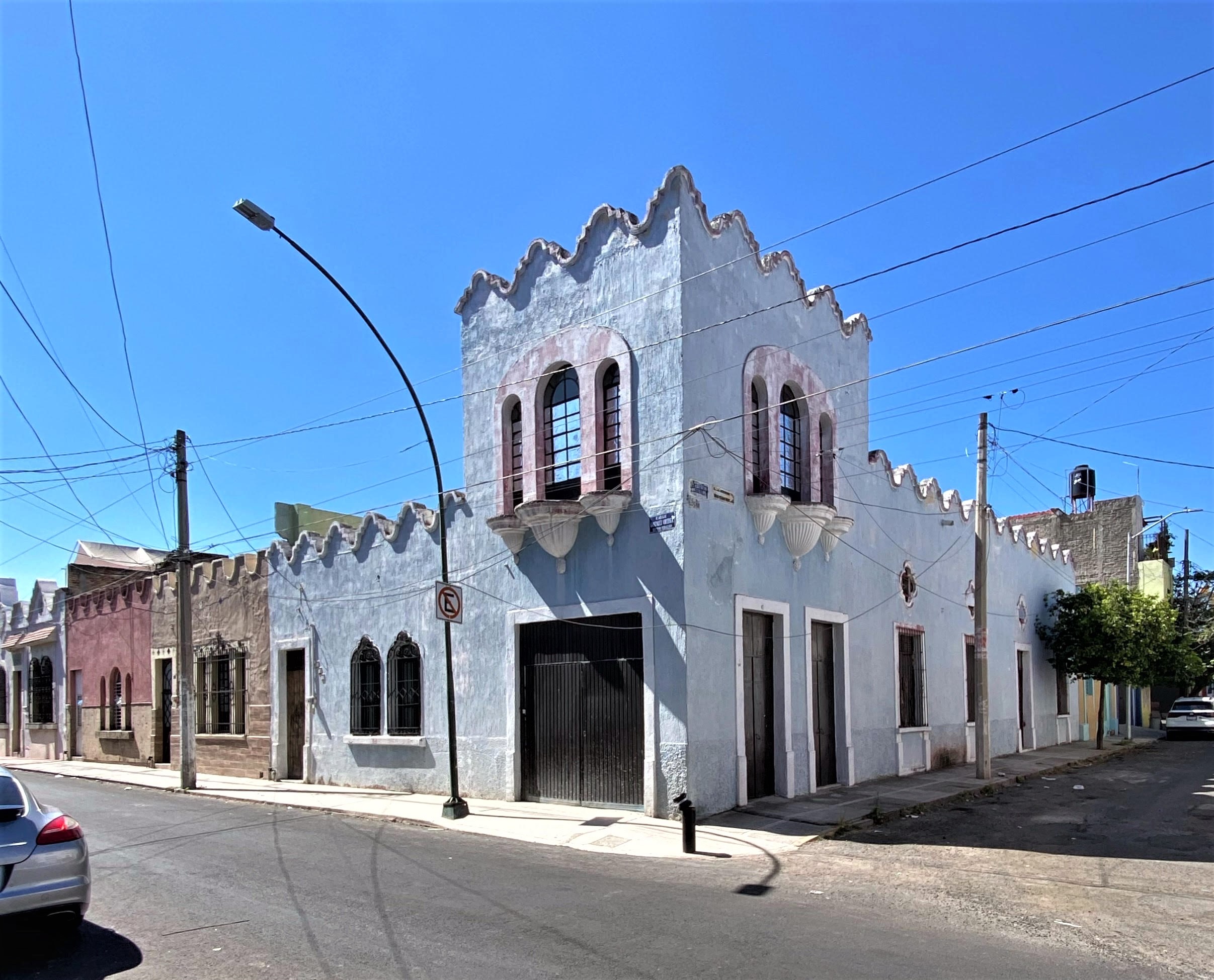 Esta fabulosa cuadra, tres calles al poniente del Paseo Alcalde, está llena de construcciones de un estilo ecléctico neocolonial fascinante, con elementos idiosincráticos que las hacen muy típicas de su lugar y su época. Esta casa esquinera es sin duda obra del mismo autor de sus vecinas inmediatas hacia el sur, pues comparten la misma planta básica y el estilo de fachada, con todo y sus pretiles en arcos invertidos y sus ventanas dobles y triples.