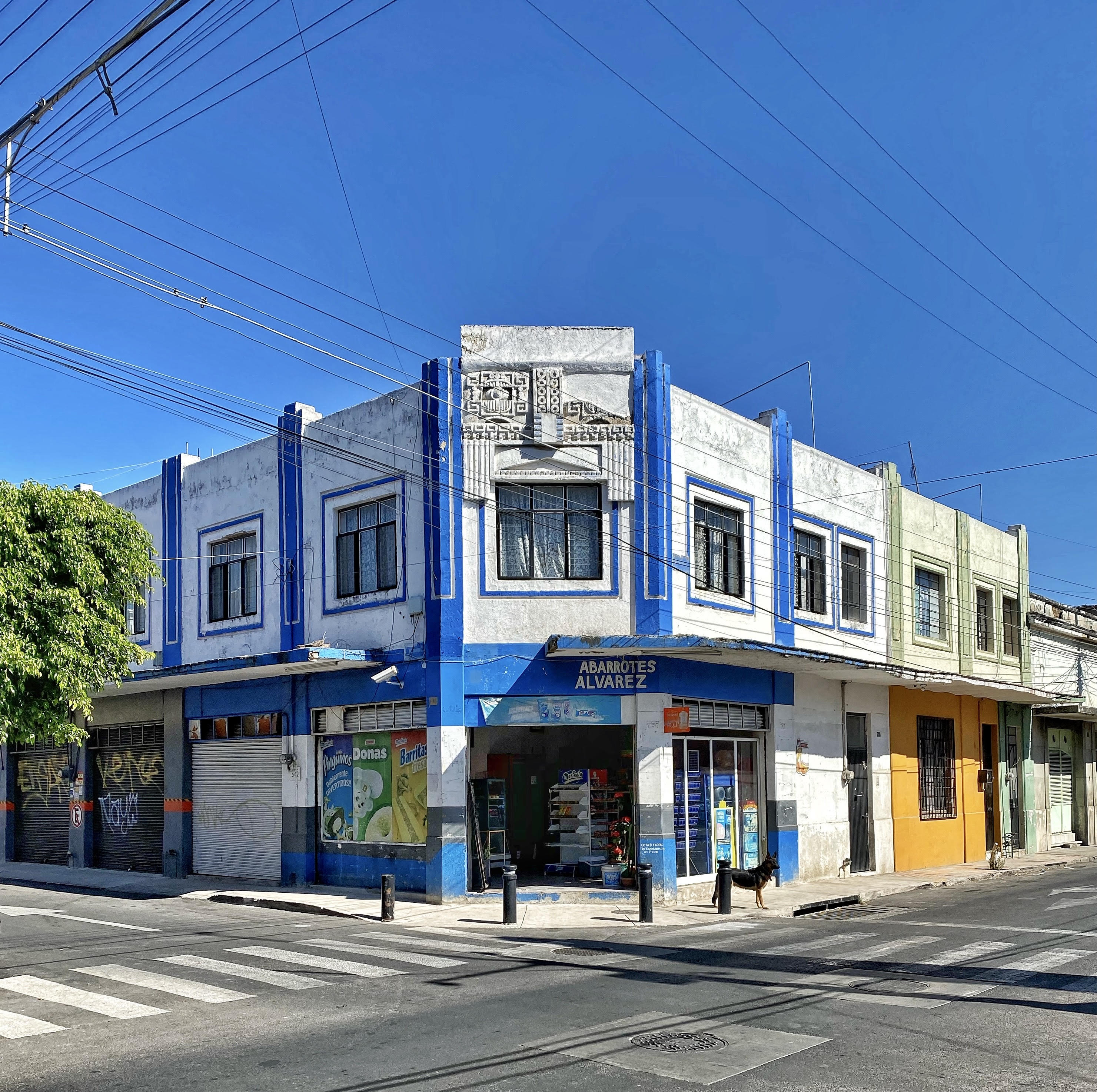 La casa / comercio que ocupa la esquina nororiente de Mezquitán y Juan Álvarez es un ejemplo del Art Déco neo indigenista o neo prehispánico con el que algunos constructores tapatíos experimentaron en los años 1930’s y 1940’s, época donde el orgullo mexicano en forma del pasado pre colonial se expresó en múltiples formas. De esa época datan los murales de Orozco y Rivera, así como las expresiones nacionalistas en casi todas las demás artes plásticas.