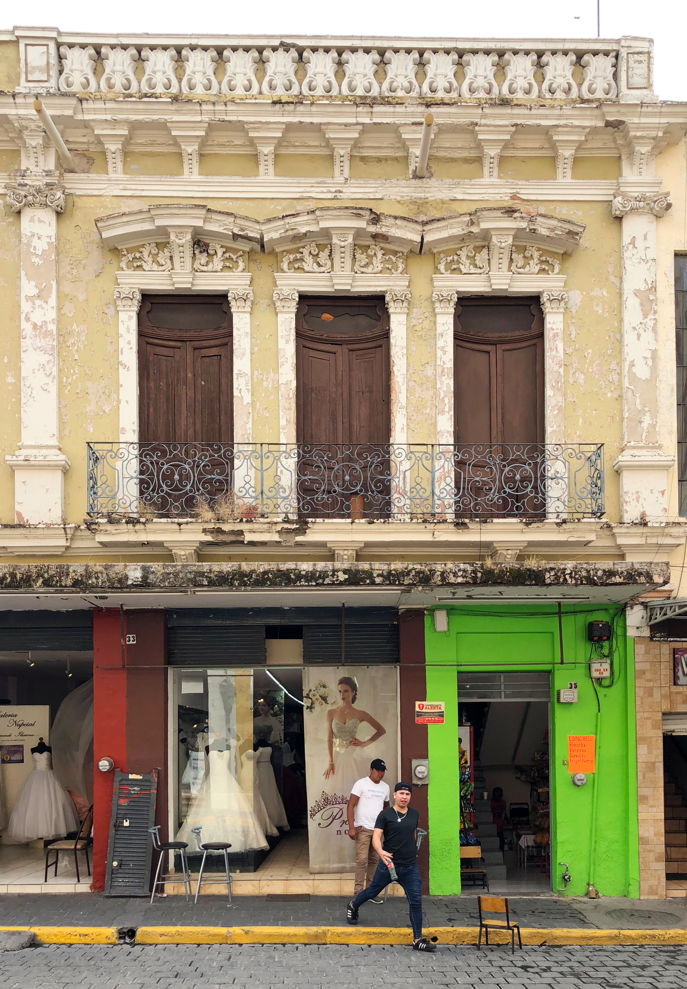 La casa de dos plantas funciona como comercio en planta baja y bodega en planta alta, en loq ue fue una vivienda construida hace unos cien años a unos pasos del Teatro Degollado. Su planta alta conserva los detalle de argamasa en pedimentos y cornizas, y destaca su balaustrada formada por elementos de yeso prefabricados, típicos del eclecticismo de la época.