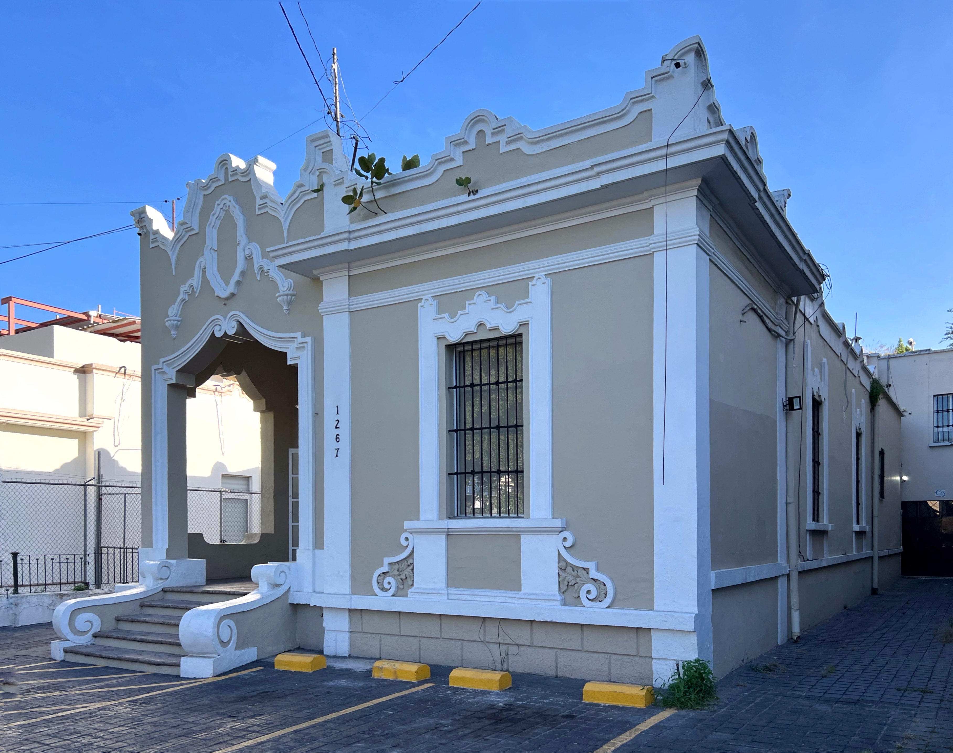 Sabemos que esta casa ya existía en 1927*, por lo tanto es posible que se haya construido alrededor de 1925. Destaca en su arquitectura la portada exterior desproporcionadamente grande para el tamaño de la casa, con un pequeño zaguán que conduce a la puerta de ingreso. El pretil de la casa forma su silueta única, y afortunadamente se conserva en muy buen estado.