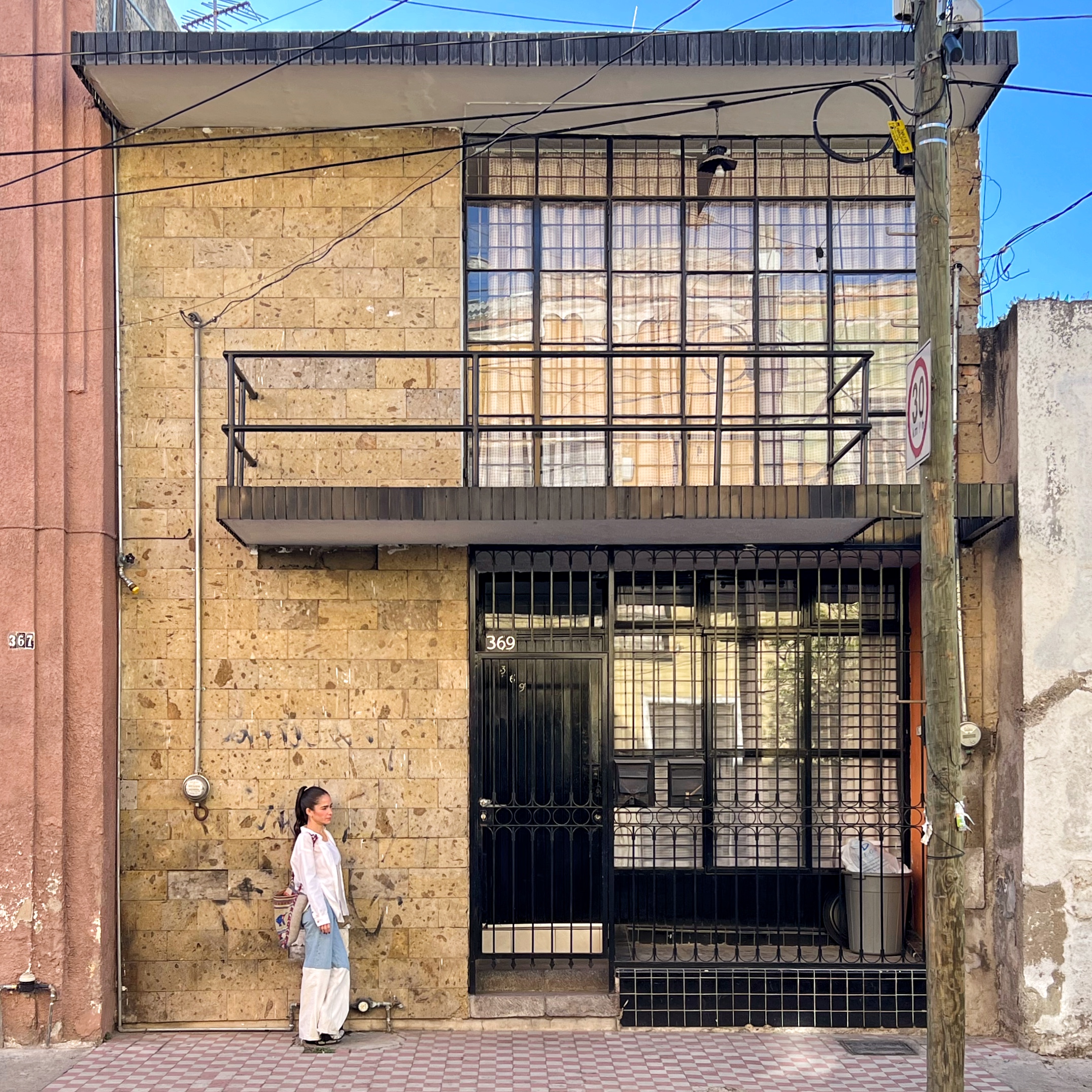 Una de ellas es ésta en el número 369; de poco frente como sus vecinas, y con poco espacio para «maniobrar», el arquitecto logró un diseño asimétrico dándole el protagonismo a la ventana en forma de cortina de cristal de la recámara principal en planta alta, combinándola con el muro de la muy Tapatía cantera amarilla, hoy ya imposible de conseguir. Un balcón corre a lo largo del mencionado ventanal y se extiende sobre la cantera, dándole sentido al diseño y rompiendo la rigidez del mismo. La marquesina superior enmarca el conjunto. Menos es más.