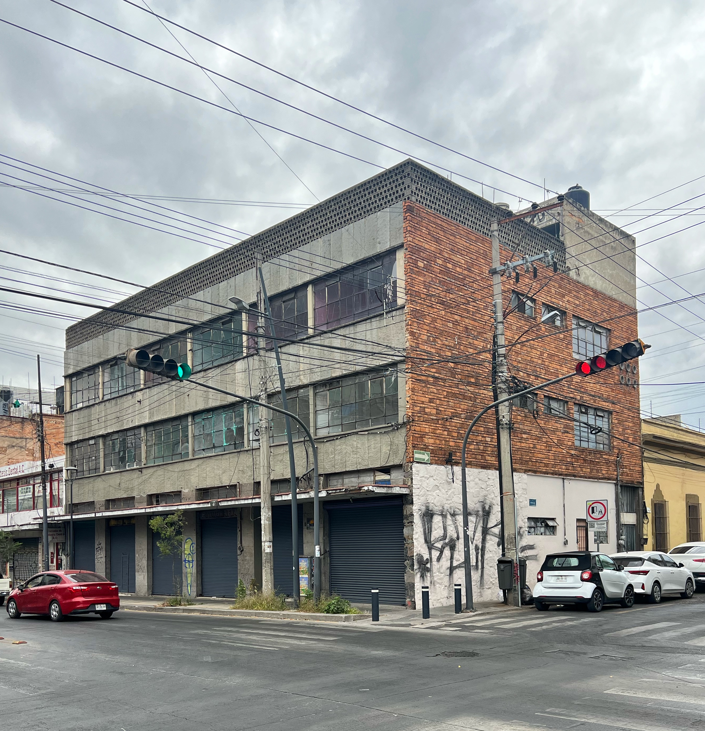 Uno de los pocos edificios destacados construidos tras la ampliación de la calle Tolsá, hoy Enrique Díaz de León, es este elegante inmueble funcionalista de tres niveles ubicado en la esquina con la calle Morelos.