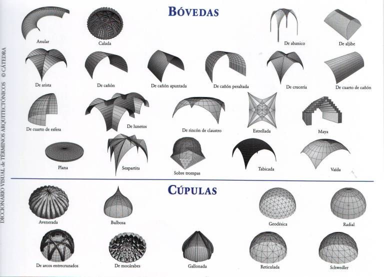 Bóveda – Estructura curva que cubre un espacio, similar a un techo arqueado, usada para formar techos o cubiertas.