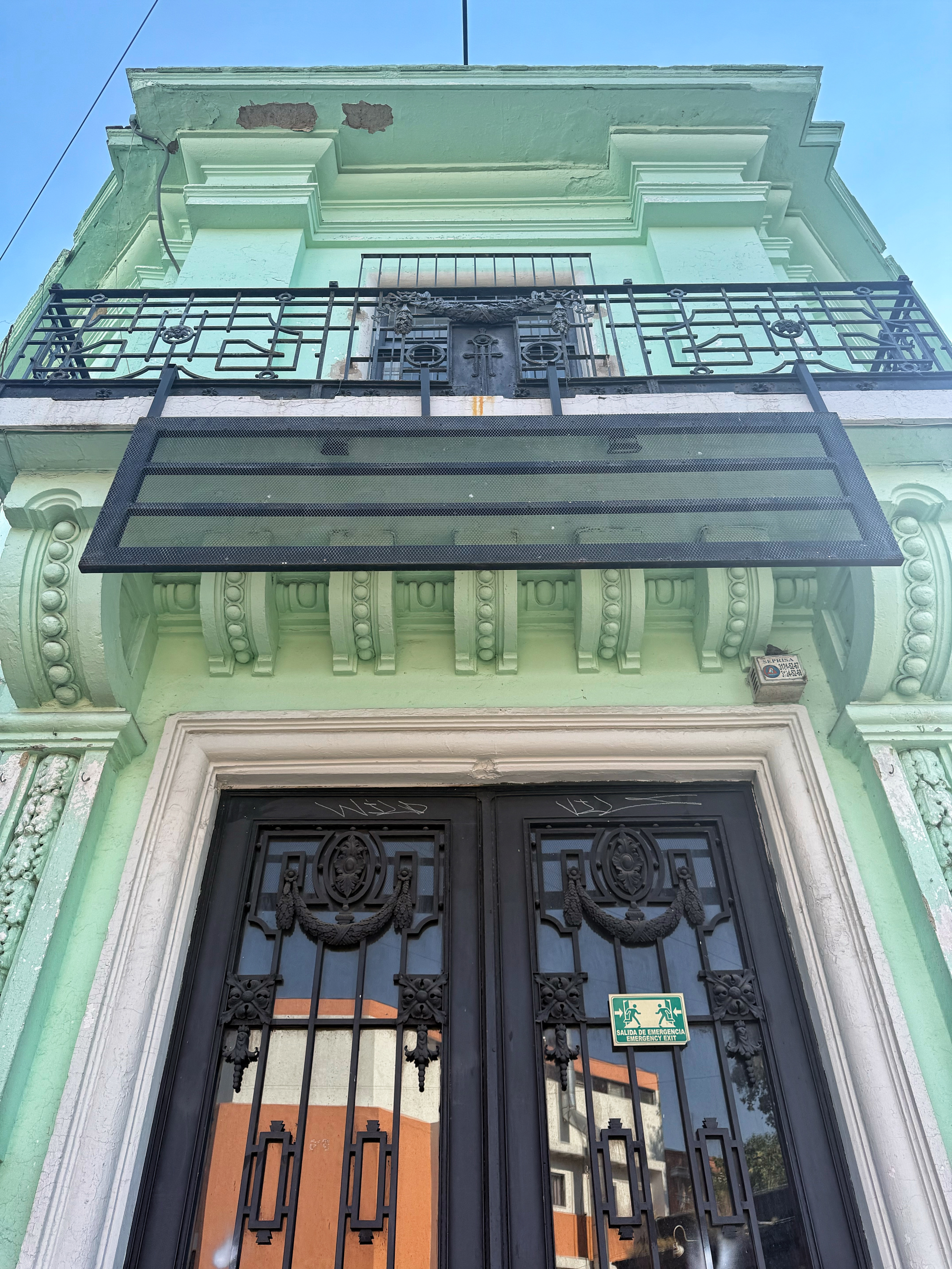 La fachada de esta casa responde al gusto ecléctico afrancesado que dominó durante el porfiriato tardío y aún sobrevivía en los años posteriores a la Revolución. Aunque más sobria que su contraparte en Alcalde, conserva una gran dignidad en su composición. Su simetría es clara, con un cuerpo central saliente flanqueado por columnas corintias adosadas que enmarcan tres vanos verticales. Sobre ellas, un balcón corrido refuerza la imagen palaciega del conjunto. Ventanas en arco de medio punto, cornisas con ménsulas y un parapeto decorativo con balaustrada completan la escena, aún visibles a pesar del deterioro y el grafiti.