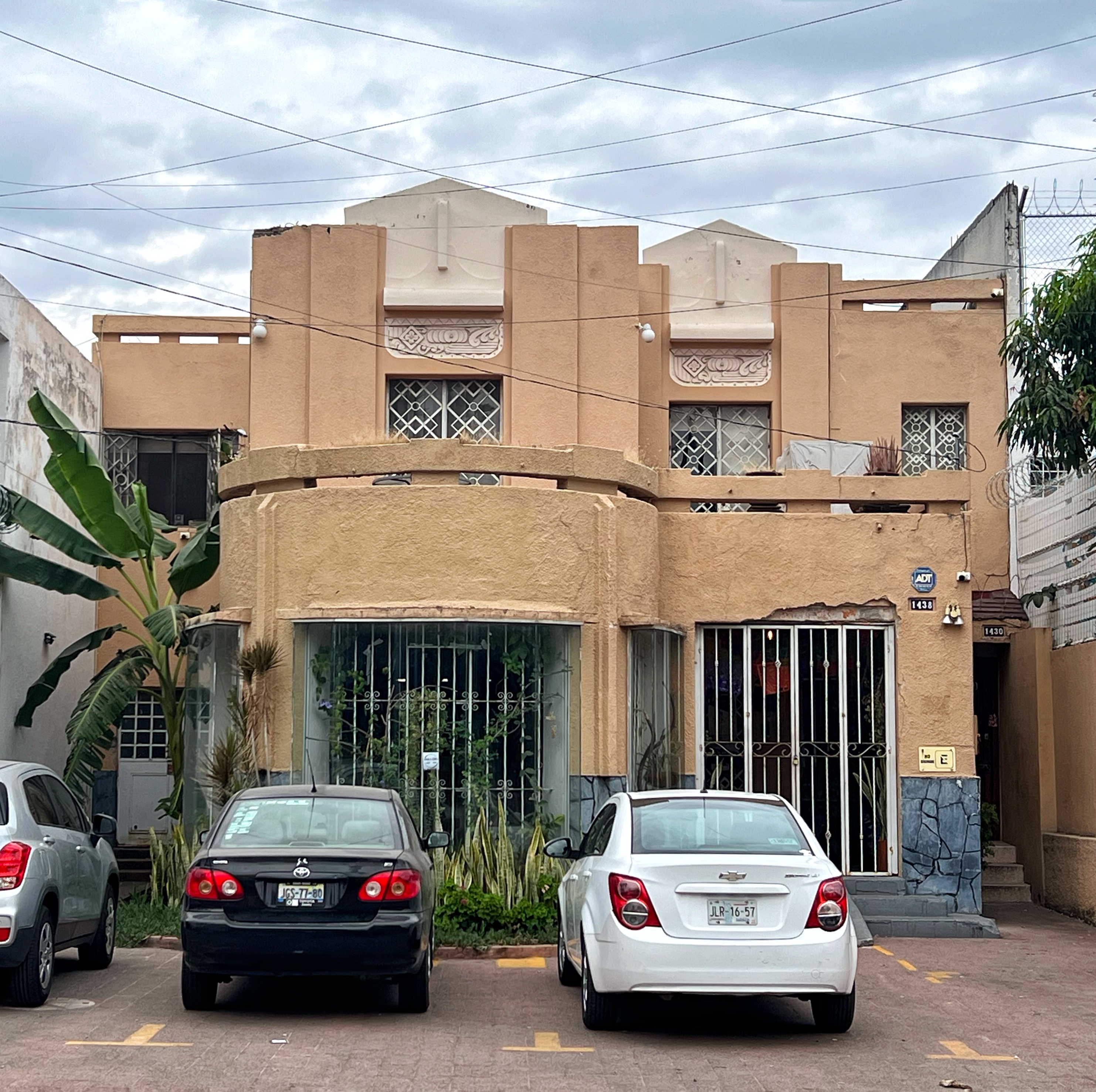 El acabado rugoso en el aplanado, típico de la época, refuerza la plasticidad del conjunto. El inmueble conserva elementos originales, pero desafortunadamente presenta adaptaciones posteriores como el estacionamiento frontal y cambios en accesos, puertas y ventanas, que responden a usos mixtos.