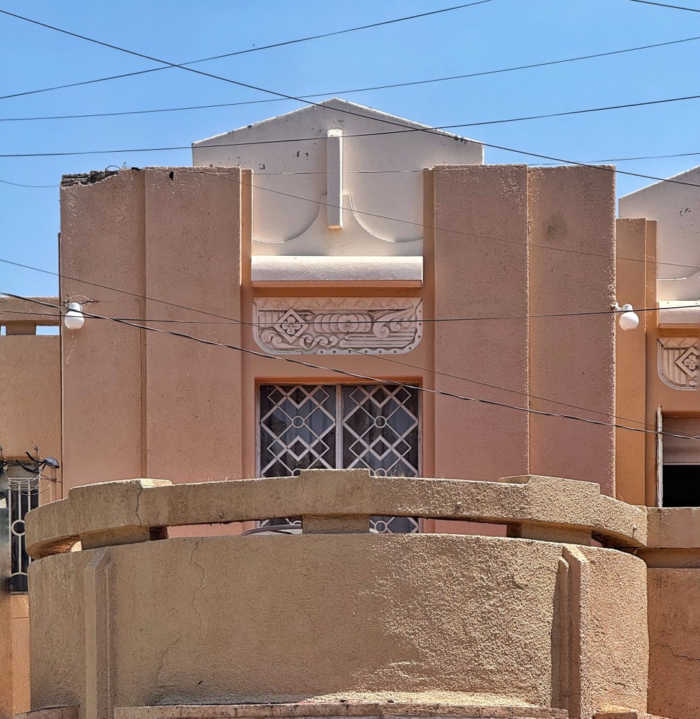 El segundo nivel se articula mediante paramentos prismáticos que enmarcan ventanas con celosías metálicas y detalles ornamentales en relieve, de clara inspiración Art Decó. En la parte superior, los remates triangulares de las azoteas acentúan el ritmo de la fachada y aportan un aire monumental.