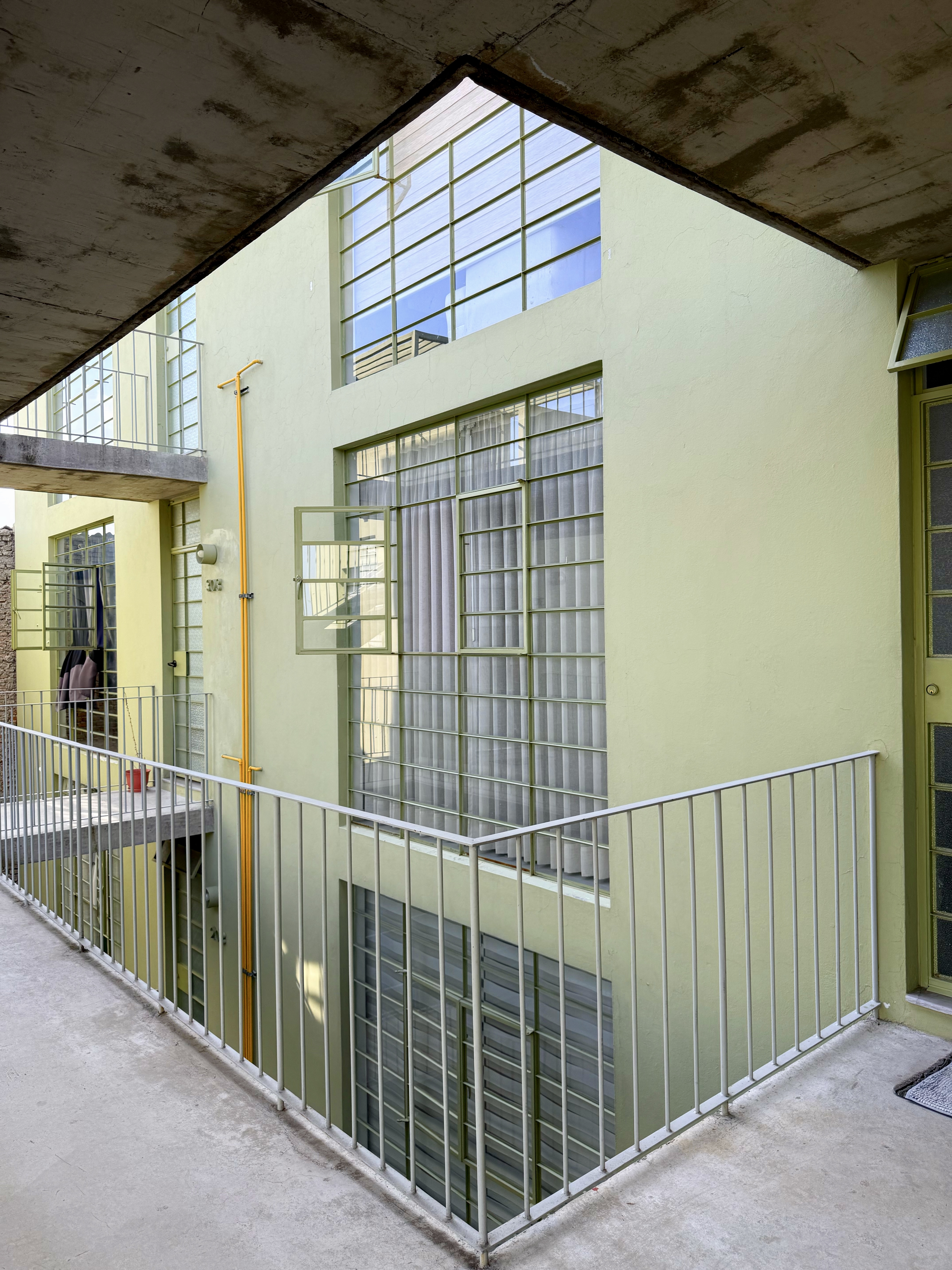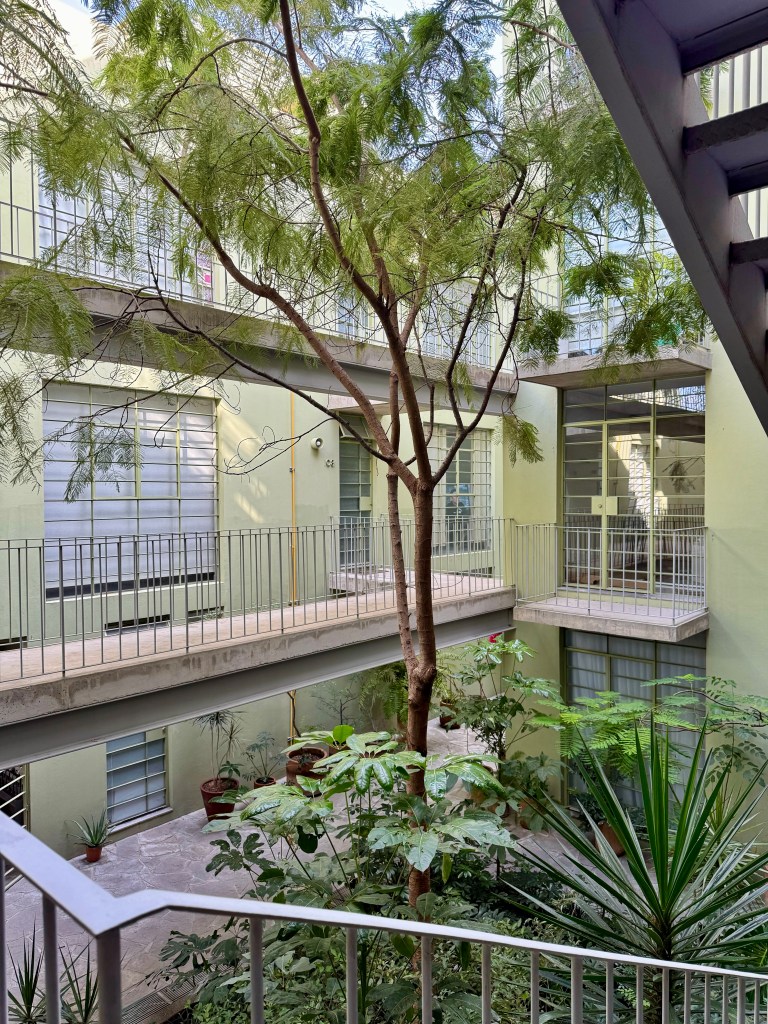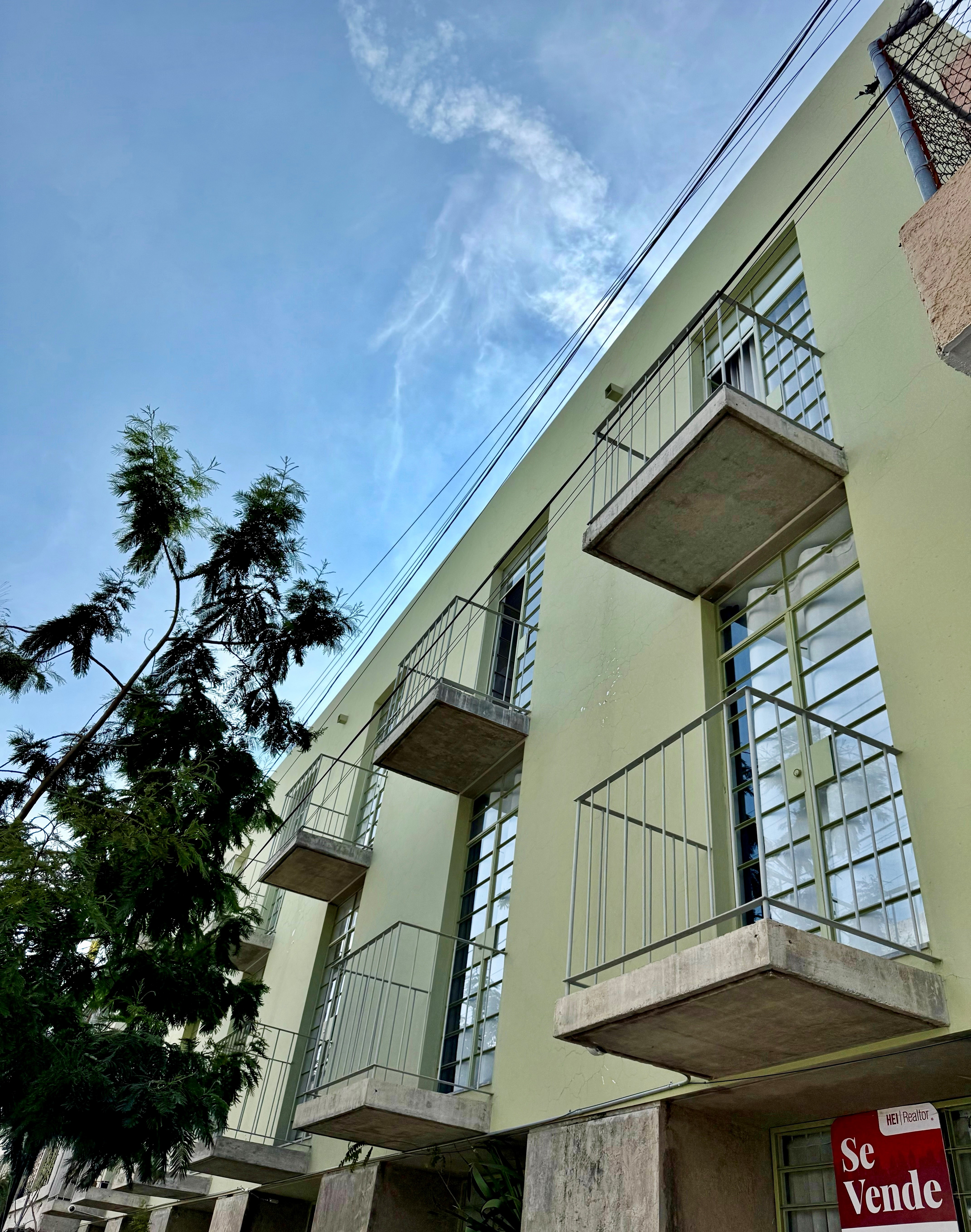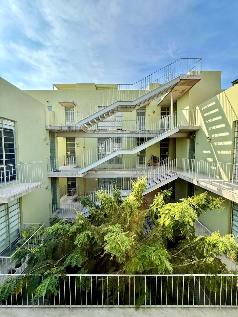 La escalera exterior, visible desde todos los niveles, se convierte en un elemento estructural y simbólico: un recorrido que articula la vida cotidiana y favorece el encuentro entre vecinos. Los volúmenes, de alturas variables (entre tres y cinco niveles), conservan hacia la calle una escala compatible con el entorno urbano inmediato. En el frente, la planta baja mantiene el uso comercial original y una pequeña unidad habitacional destinada al conserje, figura tradicional de la vivienda colectiva tapatía que “mantiene los ojos en la calle” y refuerza la seguridad comunitaria.