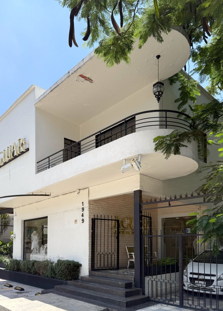 Un buen ejemplo es esta casa en la esquina de avenida Vallarta con Juan Ruiz de Alarcón. Su elemento más distintivo es el balcón en voladizo que sobresale de la esquina y cuya curvatura se repite tanto en el piso como en el techo, creando un gesto escultórico de gran elegancia. Las líneas del barandal refuerzan la sensación de ligereza y acentúan la horizontalidad del conjunto, mientras que el voladizo de más de un metro y medio destaca como el punto focal del diseño.