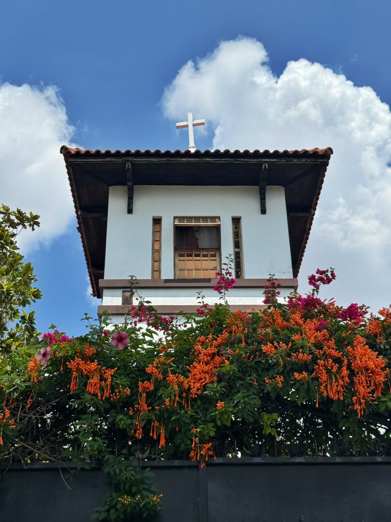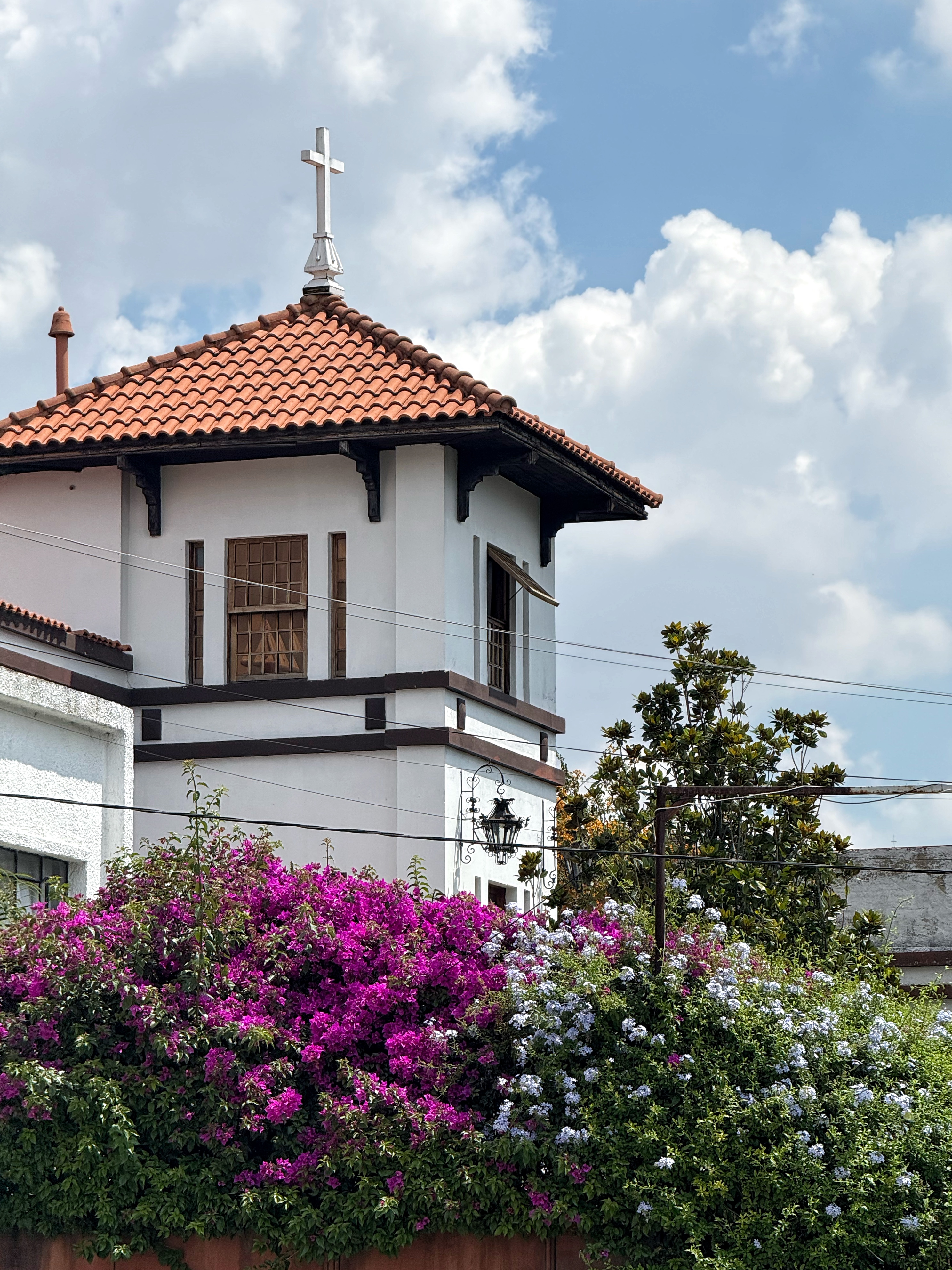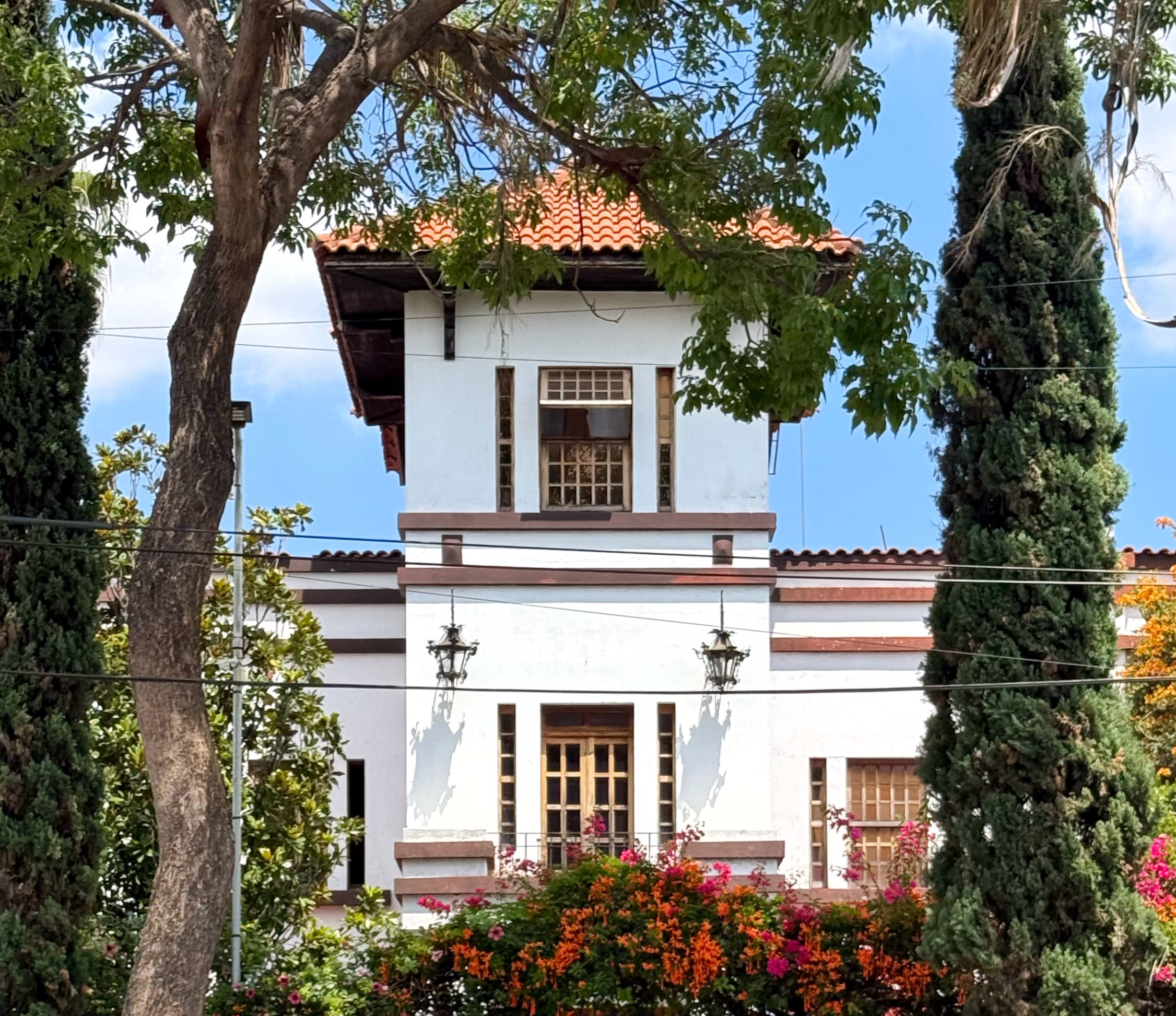 La cubierta de teja de barro, los aleros pronunciados y la vanería vertical de madera remiten al repertorio neocolonial y a la influencia hispano-californiana difundida en esos años, representada mejor por el Estilo Polanco. La discreta cruz en la cubierta añade un componente simbólico agregado cuando la construcción se convirtió en convento religioso, su uso actual.