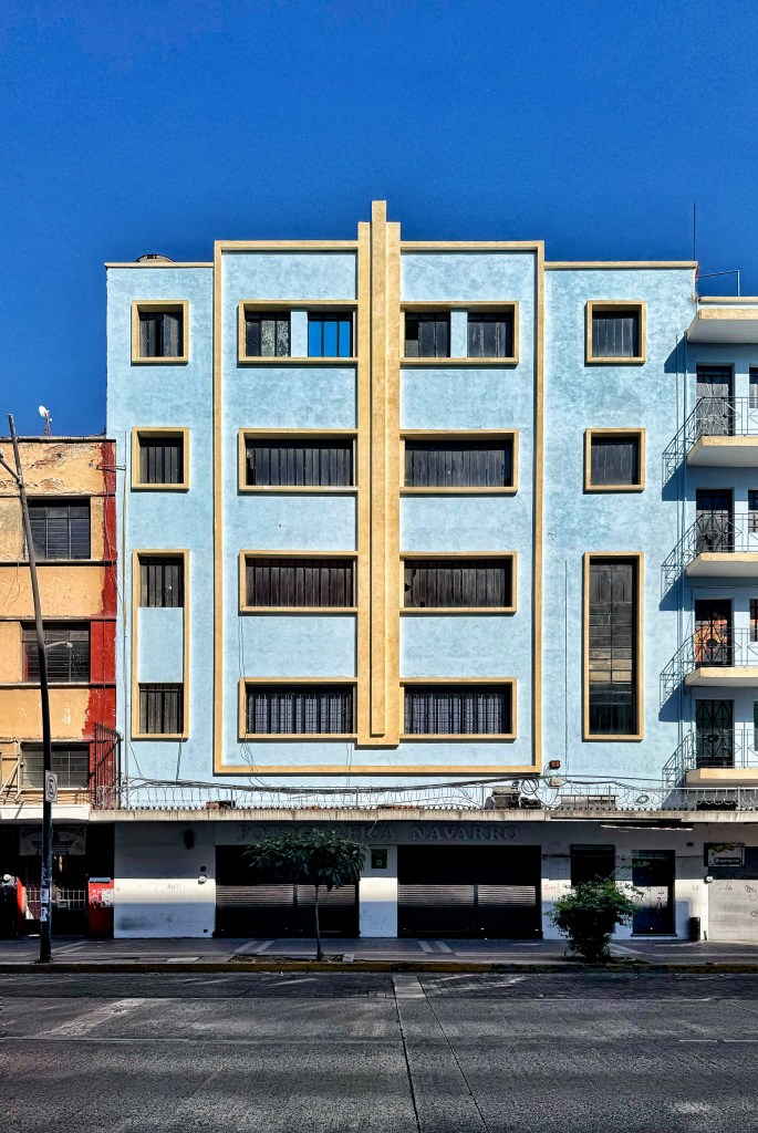 Pese a esta singularidad urbana, el conjunto no es una mera rareza. En su volumen poniente, de proporciones más convencionales, el edificio desarrolla una arquitectura moderna sobria, cercana a un art déco tardío y simplificado: ritmo regular de vanos, balcones corridos con barandales metálicos de diseño geométrico y una composición horizontal claramente marcada. La torre esquinera, en cambio, enfatiza la verticalidad y resuelve con ingenio un problema urbano impuesto por la nueva alineación vial, funcionando casi como un remate escultórico en la esquina de Juárez y Ocampo.