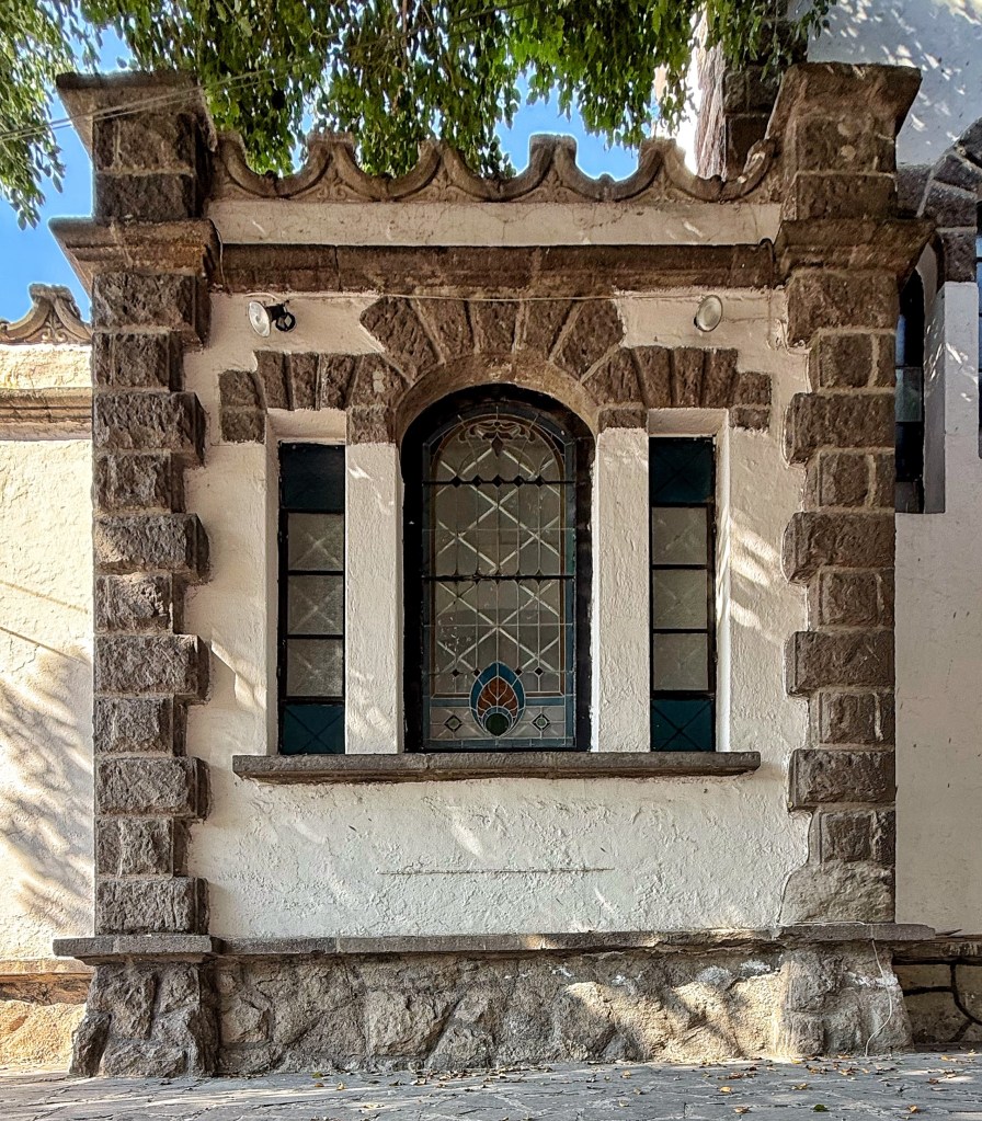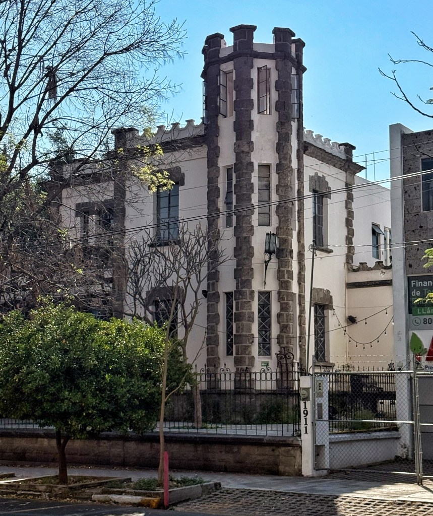 Continuando con la experimentación de estilos eclécticos de inspiración medieval, Ernesto Fuchs —desarrollador de la Colonia Francesa y prolífico constructor en la Guadalajara de principios del siglo XX— diseñó esta casa alrededor de 1915 como su hogar familiar. El lenguaje arquitectónico se manifiesta en el uso de sillares de cantera almohadillados, emplomados de colores, almenas y torres circulares que rebasan el nivel general del volumen.