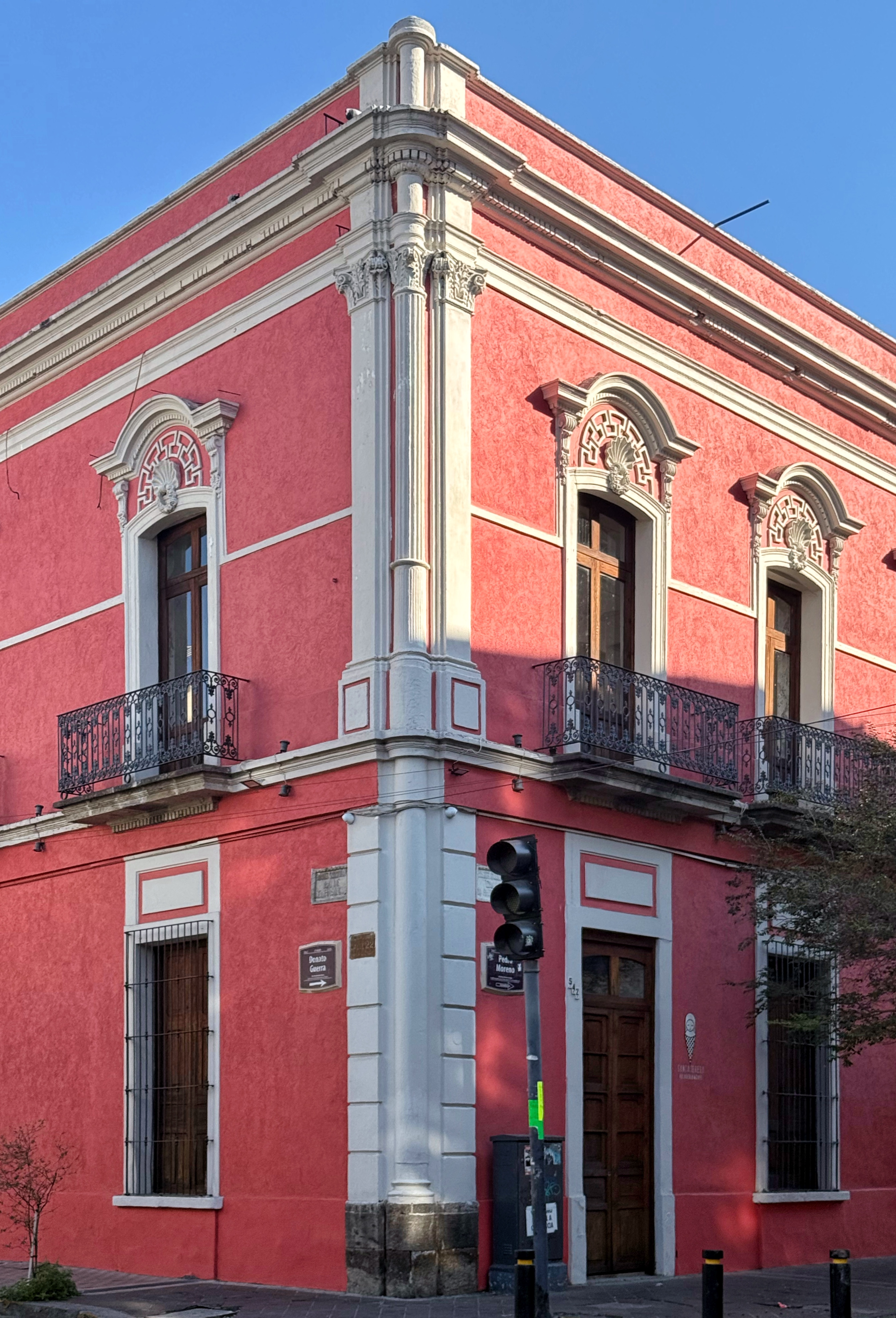 El inmueble ubicado en la esquina de Pedro Moreno y Donato Guerra formó parte del antiguo Convento de Santa Teresa, fundado entre 1690 y 1695 por la orden de las Carmelitas Descalzas. Aunque su origen es virreinal, la arquitectura que hoy se observa corresponde a una intervención posterior, probablemente realizada entre finales del siglo XIX y los primeros años del siglo XX, cuando muchos edificios del centro de Guadalajara fueron adaptados a nuevos usos y lenguajes formales.