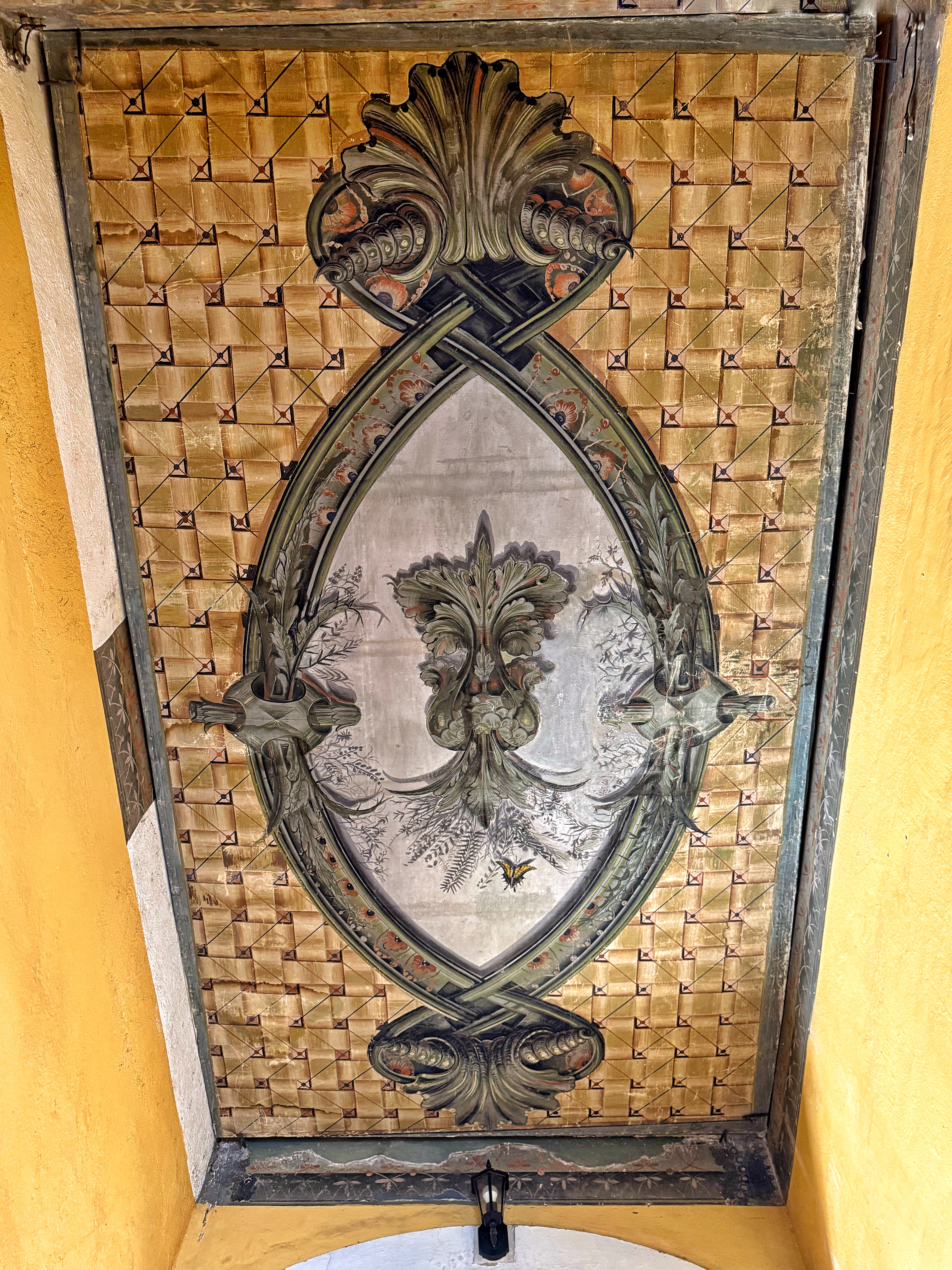 En el interior, el zaguán revela una intervención posterior: un plafón decorado con motivos eclécticos de influencia art nouveau, con composición centralizada, relieves vegetales estilizados y una retícula geométrica de fondo. Este elemento sugiere una actualización ornamental de inicios del siglo XX, superpuesta a una estructura más antigua.